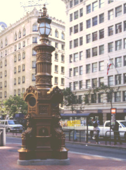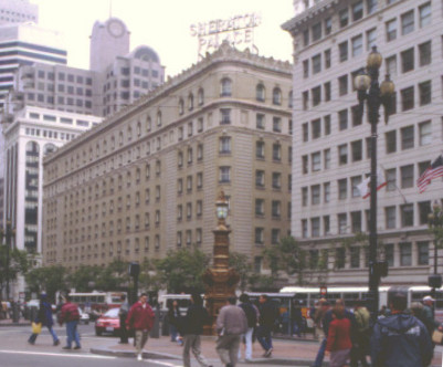 Above, Market Street at Geary in the 1880s. The imposing building (center) is the original Palace Hotel which, when it opened in 1875, was promoted as one of the finest hotels in the world. It survived with minor structural damage the early morning earthquake of April 18 1906 but was consumed by fire later that afternoon, as were all other buildings seen here. In those days cable cars were not limited to Powell Street and Fisherman's Wharf but ran along several major streets in San Francisco. Lotta's Fountain survived the quake and the fire, and today can be seen at the same location (below).