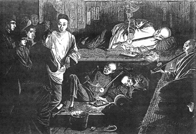 illustration of a Chinatown opium den first appeared in Passing through an alley-way, we entered a perfectly dark court where nothing was to be seen but so much to be smelled that the imagination became more painful than the reality could have been. A light twinkled from some windows on a level with the side-walk, and our guide unceremoniously pushing open the door led us into a small, close, but apparently clean room, filled with the fumes of burning opiumresembling those of roasting ground-nuts, and not disagreeable. A table stood in the centre, and around three sides ran a double tier of shelves and bunks, covered with matting and with round logs of wood with a space hollowed out, cushioned or bare, for pillows. Nearly all of these were filled with Chinamen, many of them containing two, with a little tray between them, holding a lamp and a horn box filled with the black, semi-liquid opium paste. But although every one was smoking, it was so early in the evening that the drug had not as yet wrought its full effect, and all were wide awake, talking, laughing, and apparently enjoying themselves hugely. The largest of the Chinamen was lying